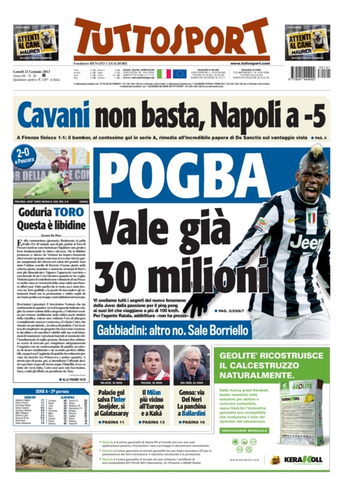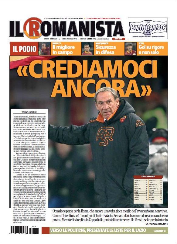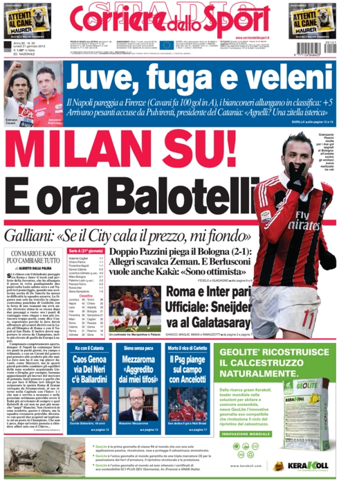 Finalmente sulle prime pagine dei giornali sportivi si parla di calcio giocato. La giornata di ieri di campionato ha donato molti spunti, il più importante dei quali pare essere la vittoria del Milan sul Bologna, e soprattutto il ritorno al gol di Pazzini. Non c’è solo questo però dato che si parla ancora della gran vittoria della Juve sull’Udinese di sabato scorso, ma anche del pari di ieri sera tra Roma e Inter. Un pareggio che non serve a nessuno ma che ha mostrato due squadre in salute.