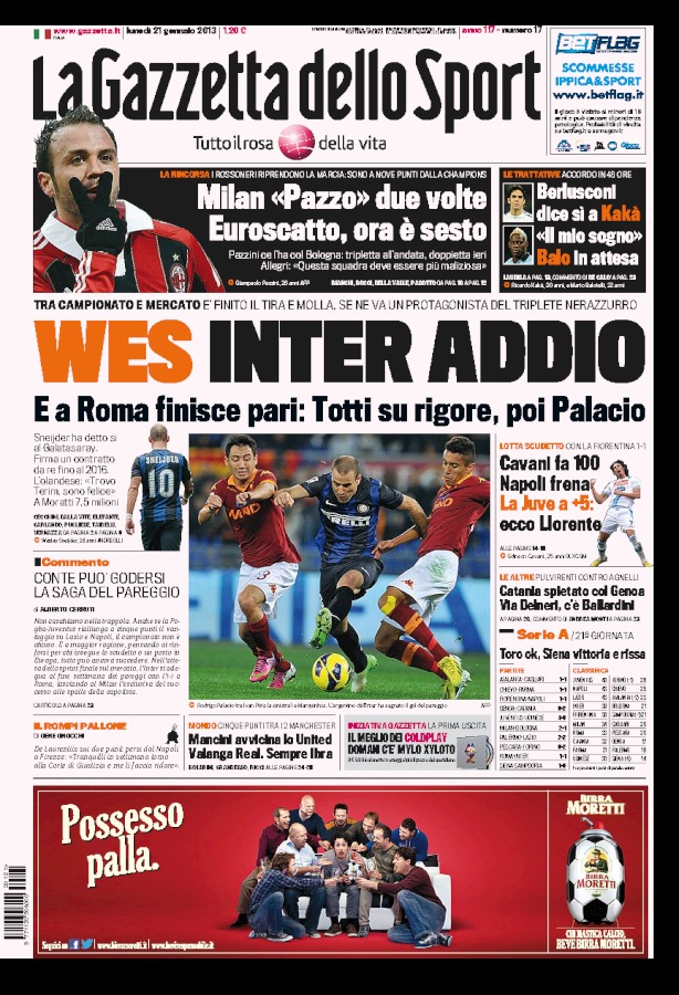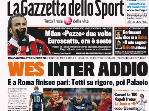 Recrimina il Romanista che afferma che quella di ieri è stata un’occasione persa, ma siamo sicuri che per gli interisti è esattamente il contrario. La finestra di mercato oggi è aperta ancora sul Milan, e sempre sui nomi “caldi” Kakà e Balotelli, mentre la notizia del giorno è l’ufficializzazione del trasferimento di Sneijder al Galatasaray. A voi le prime pagine di oggi.