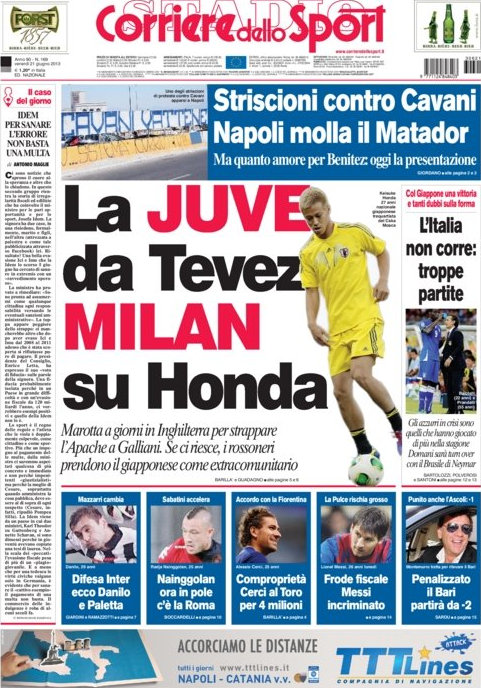 L’altra bomba di mercato è Honda, di cui avevamo già parlato settimane fa, che torna di moda tra i rossoneri per prendere il posto del trequartista richiesto da Berlusconi. Tra le altre notizie di mercato c’è il Napoli, con i tifosi che chiedono a Cavani di andarsene in fretta, il riscatto di Cerci da parte del Toro e Cassano verso Parma, mentre il Romanista chiede alla società di trattenere De Rossi, uno dei più positivi dell’Italia in questi giorni.