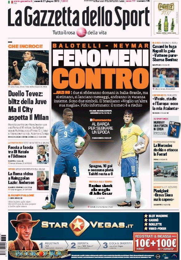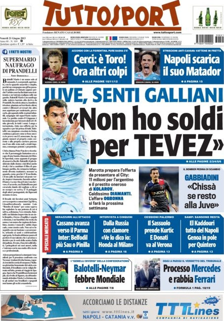 Confederations Cup e calciomercato tengono ancora banco sulle prime pagine dei giornali sportivi di oggi. Ad accendere la fantasia dei tifosi oggi sono maggiormente gli scambi, come dimostrano il Corriere e Tuttosport che aprono con importanti voci di mercato, mentre la Confederations passa in secondo piano. Al centro dell’attenzione c’è ancora Tevez, la cui vicenda comincia a delinearsi. Secondo quanto riportano i giornali italiani, la Juve avrebbe presentato un’offerta da 10 milioni, forse 11 per il quotidiano torinese, mentre il Milan ne ha promessa una da 12, ma solo se riuscisse a vendere Robinho. Il City vorrebbe cedere Tevez ai rossoneri, ma non può nemmeno portarla per le lunghe.
