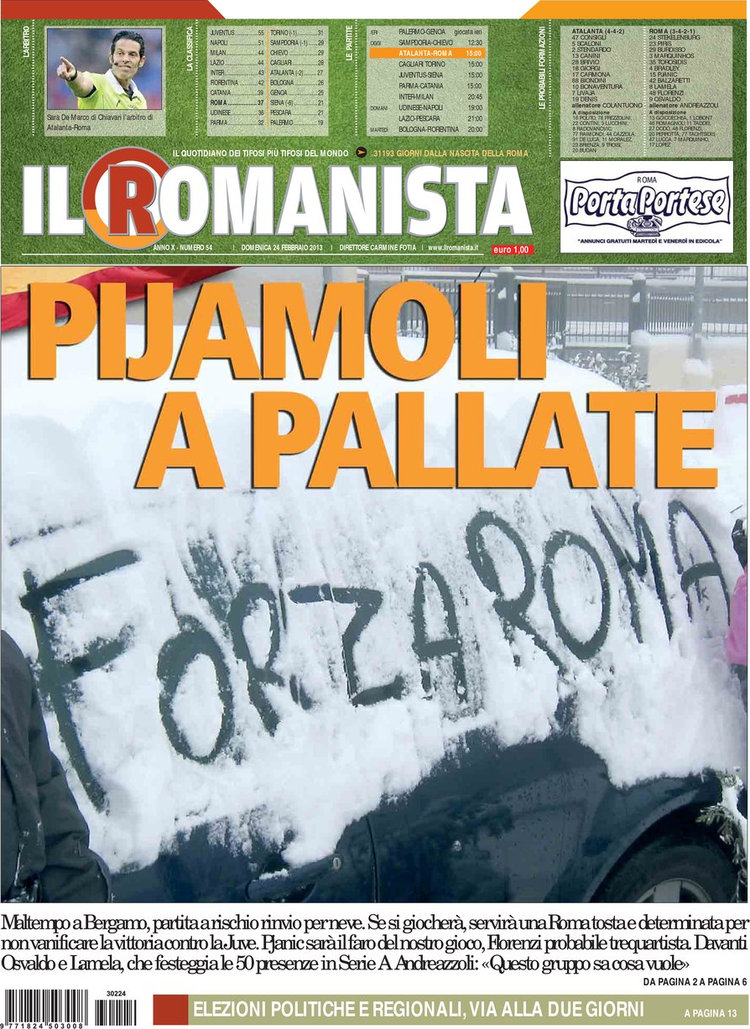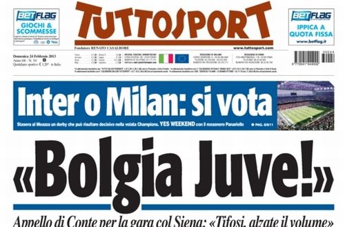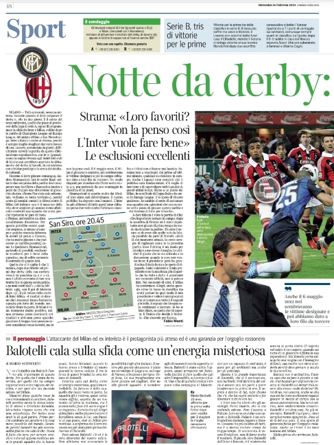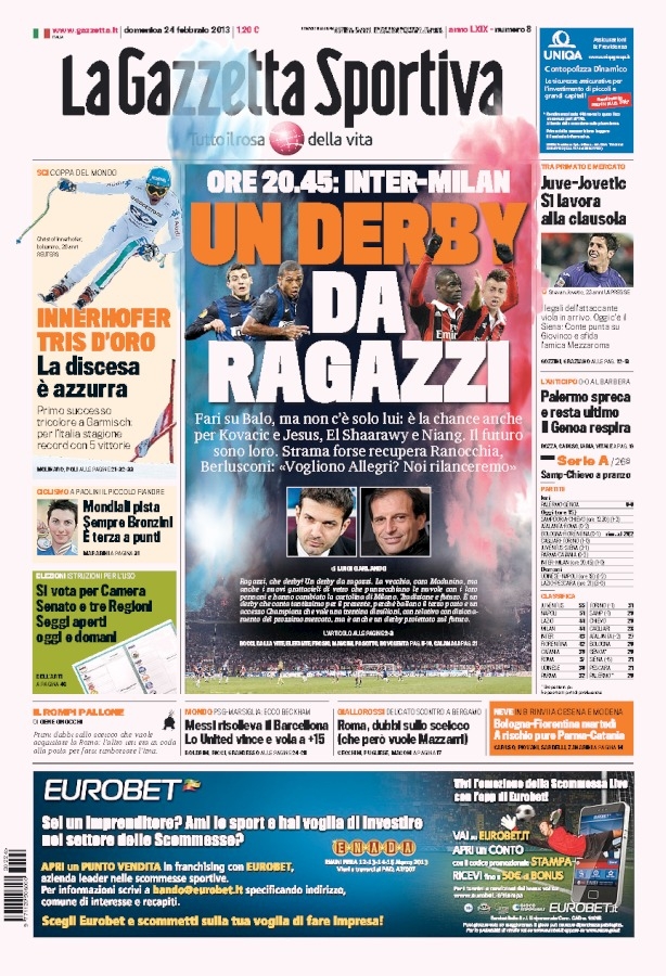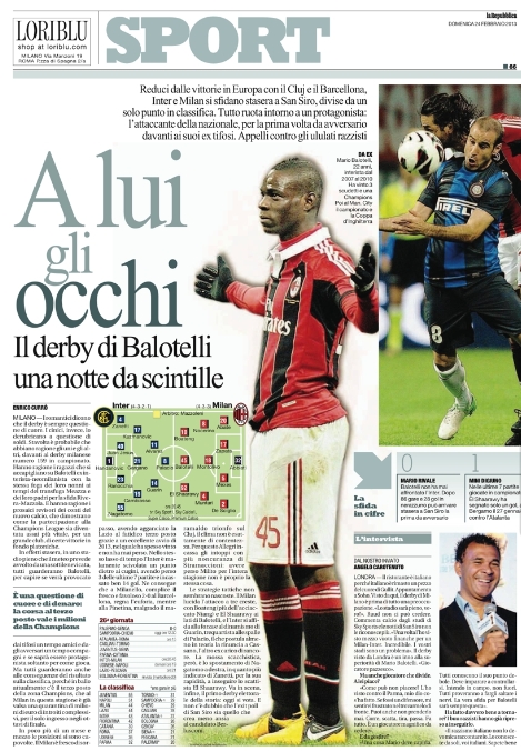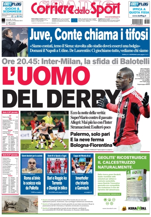 Il gran giorno del derby milanese si incrocia con quello delle elezioni politiche, e così alcuni giornali giocano intrecciando questi due eventi. Le attenzioni sono comunque rivolte tutte verso i due protagonisti di questa stracittadina, gli ex compagni in nazionale Cassano e Balotelli, i due in grado di far pendere l’ago della bilancia con una giocata da una parte o dall’altra.