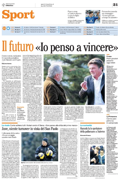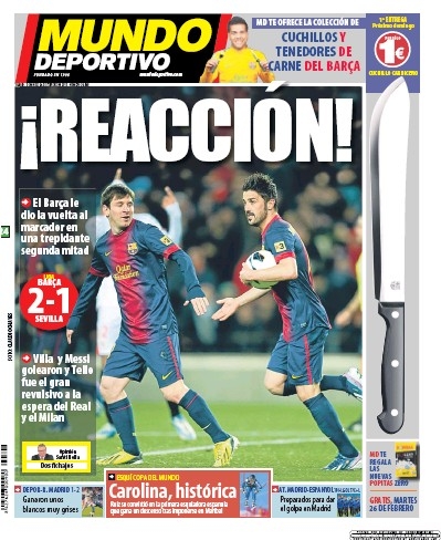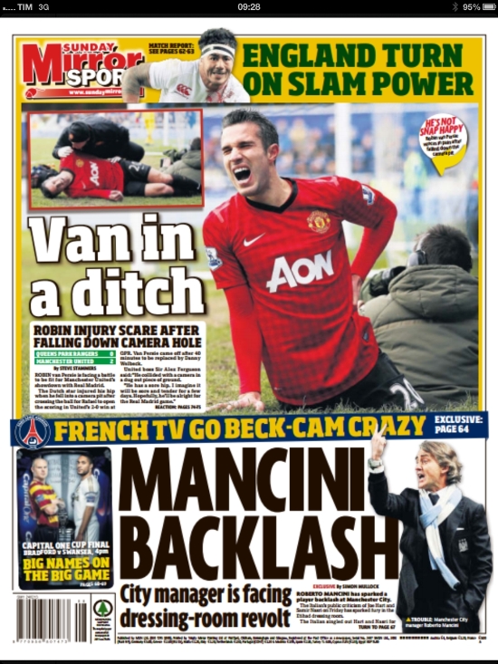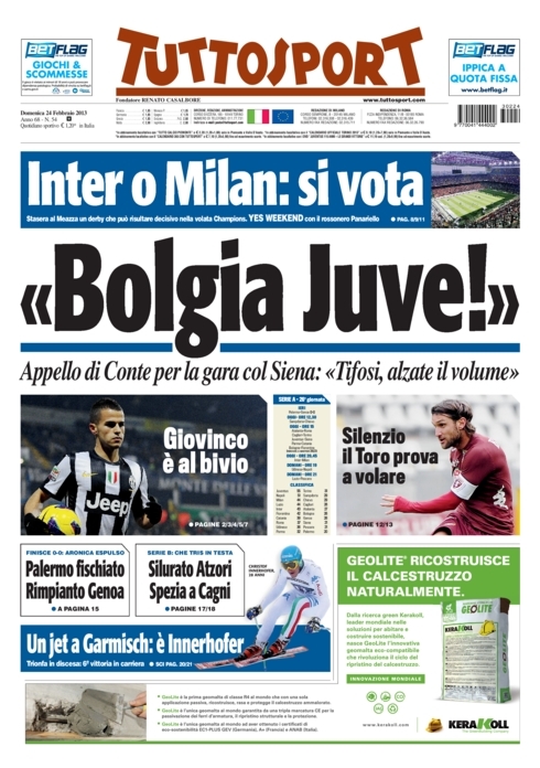 Se tutte le attenzioni sono su di loro, la Juve continua a ritagliarsi un po’ di spazio sui quotidiani parlando di mercato (si ritorna a parlare di Jovetic) e dell’emergenza che affronterà in occasione della sfida contro il Siena di oggi pomeriggio. Si parla anche di Napoli, e soprattutto del suo incerto futuro, e di Roma, con la gara a rischio per neve. In Spagna sperano nella “remuntada” in Champions League, e così i giornali nazionali mettono in risalto la capacità di Real e Barça di compiere queste rimonte, anche se in campionato e con squadre decisamente meno forti di Manchester United e Milan. Ma andiamole a vedere queste prime pagine di oggi.
