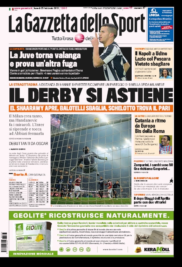 Anche se siamo nel day after del derby, le prime pagine sono tutte per la Juve. Pareggiando infatti, automaticamente Inter e Milan si tirano fuori dalla volata per lo scudetto, mantenendo come unico obiettivo la lotta per il terzo posto. Il giocatore più celebrato però è Handanovic in grado di prenderle davvero tutte, tanto da arrivare a meritarsi voti stratosferici, persino un 9 tra le varie pagelle dei quotidiani.