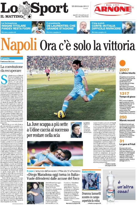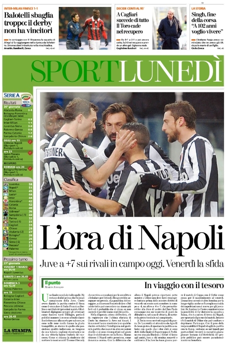 Ad ogni modo ora le attenzioni sono tutte rivolte su Napoli-Juventus di venerdì prossimo, la gara che probabilmente deciderà la corsa scudetto, anche se ci si dimentica che stasera i partenopei devono ancora scendere in campo e che se non vincono avranno molta meno spinta nella prossima giornata. Se ne ricordano solo i giornali più vicini a questa sfida, e cioè il Mattino, la Stampa e Tuttosport.