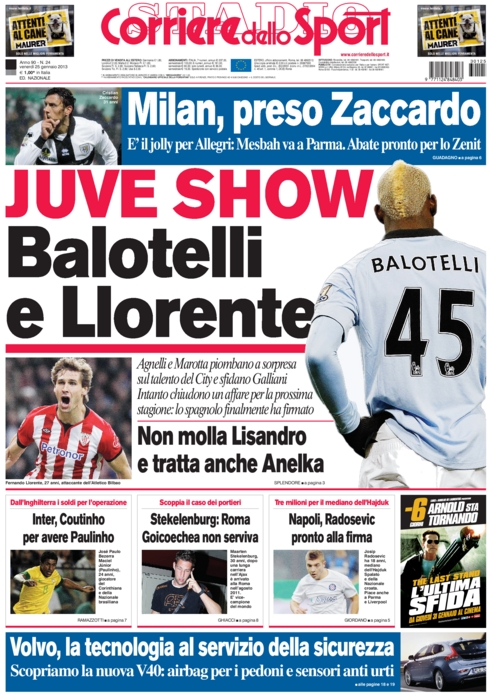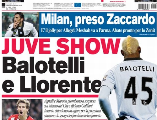È un 25 gennaio ricco di spunti quello che stiamo per vivere. Sicuramente la notizia principale è che in Italia qualche giocatore forte ancora arriva. Per adesso non se ne vedono, ma a luglio ne arriverà uno alla Juventus ed è Llorente ufficializzato ieri. I quotidiani sportivi però fanno passare questo acquisto in secondo piano oggi dato che pensano già al prossimo colpo di mercato dei bianconeri. Si parla di Lisandro Lopez, di Anelka, e persino di Balotelli per un dispetto al Milan che personalmente credo non avverrà mai.