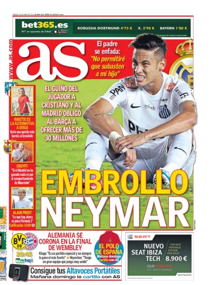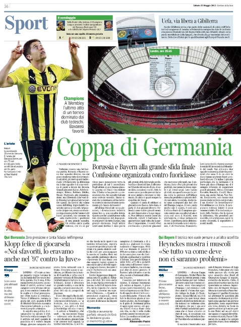 In casa Milan invece si tenta di ricucire lo strappo tra Berlusconi e Allegri nel tentativo di far rimanere il tecnico per un altro anno. A Roma invece si pensa soltanto alla Coppa Italia e così l’ultimo appello arriva da Daniele De Rossi che chiede calma a tutti, a cominciare proprio dai calciatori in campo che devono dare il buon esempio. All’estero invece si comincia a parlare della finale di Champions League di domani, ma soprattutto dell’affare-Neymar che secondo El Mundo Deportivo avrebbe firmato con il Barcellona.