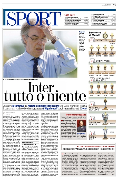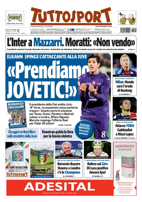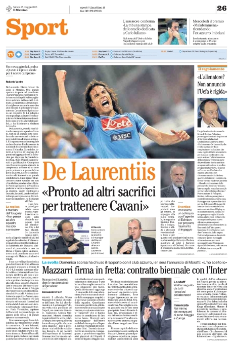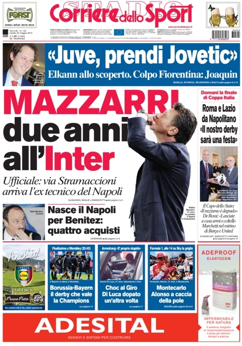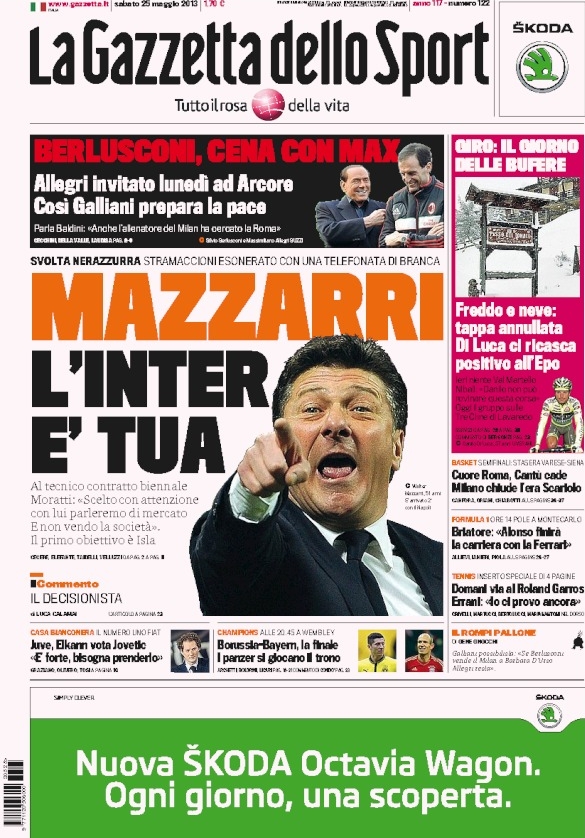 La notizia del giorno è senza dubbio il cambio di panchina all’Inter. Come vi abbiamo già anticipato noi ieri, Walter Mazzarri ha firmato per i nerazzurri ed è pronto ad una nuova rinascita del club che ha preferito l’esperienza al talento di Stramaccioni. Si aprono con questa notizia tutti i principali giornali sportivi di oggi, tanto che sembra non ci siano altre notizie importanti. Eppure ce ne sarebbero, specialmente per quanto riguarda il mercato.