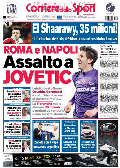 Archiviata la “lezione tedesca”, come molti giornali hanno titolato, si ritorna a parlare di calcio giocato e soprattutto italiano. Questa mattina apriamo con un’indiscrezione che ha del clamoroso: su Jovetic sarebbero spuntate anche Roma e Napoli. La Fiorentina finora non ha mai voluto cedere il montenegrino alla Juve, ma lui voleva restare in Italia. Chissà che, secondo quello che dice il Corriere dello Sport, le alternative Roma e Napoli non siano viste con maggiore favore rispetto a quella bianconera.