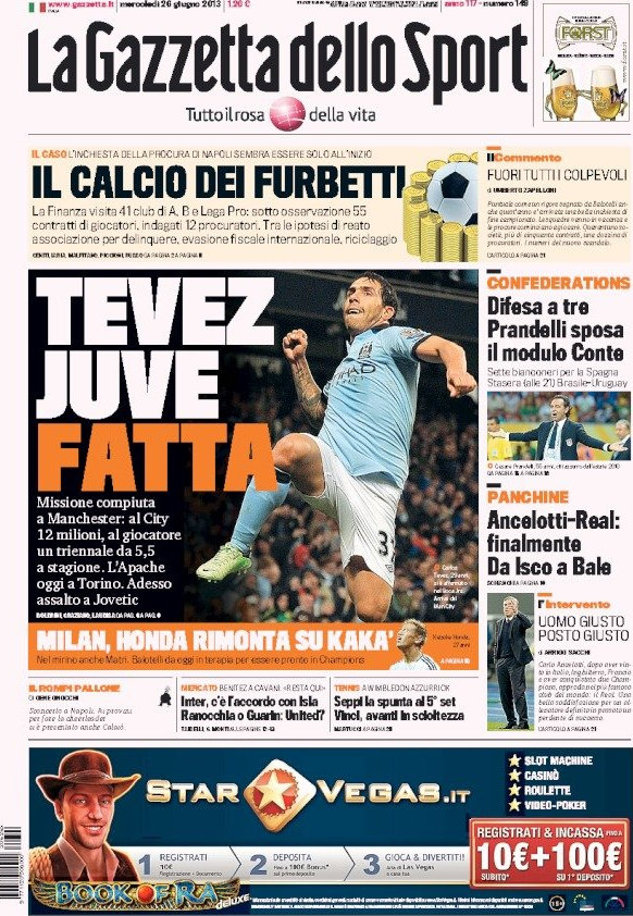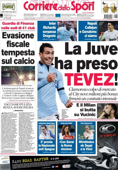 Anche il Napoli potrebbe chiudere presto per dei signori calciatori come Callejon e Gonalons, l’Inter invece continua a fare passi indietro prendendo giocatori di fascia media, mentre la Roma sembra essere sempre più vicina a Julio Cesar. La notizia del giorno però, oltre a Tevez, riguarda il blitz della Guardia di Finanza che potrebbe aprire un altro scandalo nel calcio italiano, quello stavolta dell’evasione fiscale. Ci mancava solo quella.