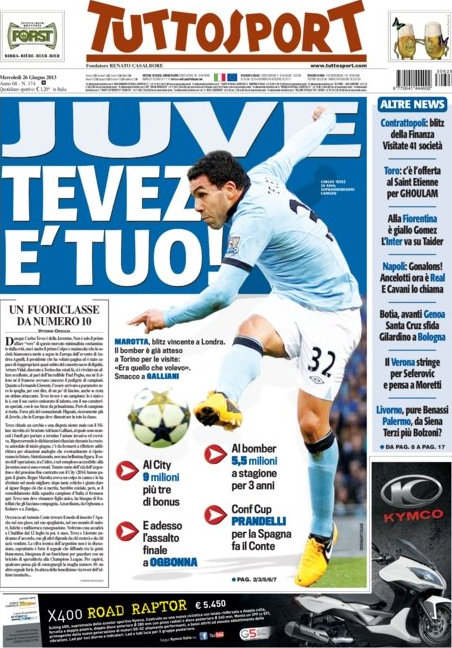 Carlos Tevez va alla Juventus. Diamo questa notizia con un pizzico di orgoglio non per una questione di tifo, ma perché è una notizia che in un calcio come quello italiano sempre senza soldi ed in cui di solito i campioni vanno via, ce n’è qualcuno che arriva. Marotta riesce a chiudere l’affare del secolo in quel di Manchester, portando alla Juve un attaccante da 25-30 gol a stagione, pagandolo quattro spiccioli, appena 9 milioni più 3 di bonus. Secondo quanto riportano i principali giornali, ora Tevez è atteso a Torino per le visite mediche e poi ci sarà la tanto attesa firma.