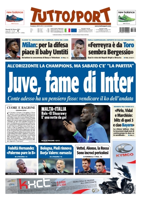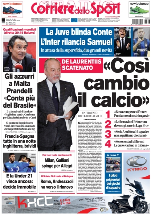 Le prime pagine dei giornali sportivi di oggi 26 marzo 2013