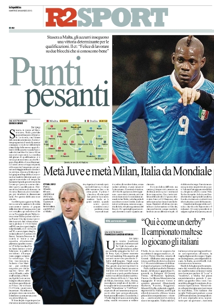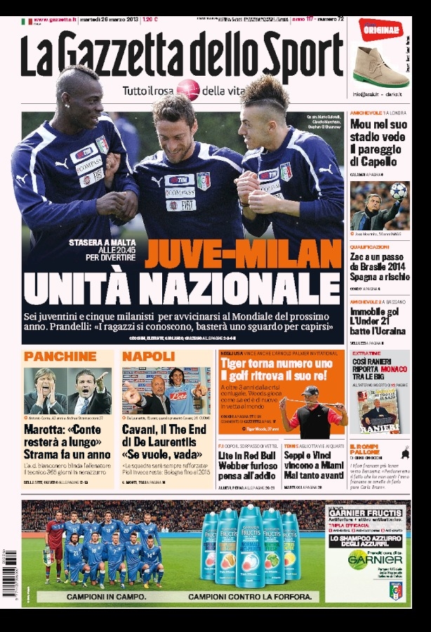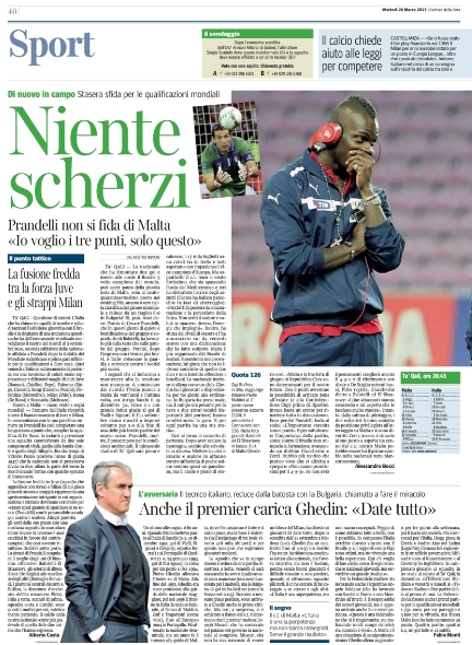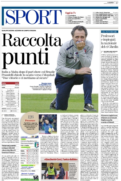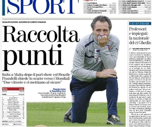 La giornata di oggi è caratterizzata dagli impegni delle nazionali per le qualificazioni a Brasile 2014. L’Italia, com’è noto, ha l’impegno più facile di tutti, quello contro Malta che, teoricamente, dovrebbe essere una goleada. Nonostante questo però, vista la storica difficoltà degli azzurri ad affrontare le squadre molto meno forti di loro (ricordate la Nuova Zelanda?) ormai nessuno si fida più e così tutti i giornali predicano attenzione.
