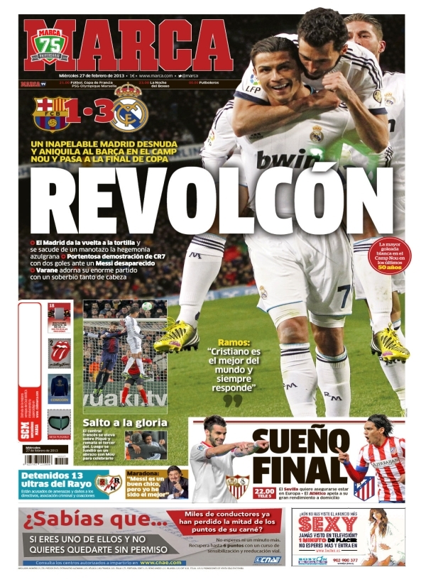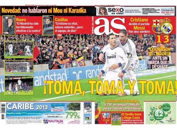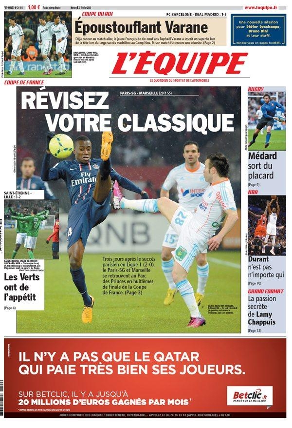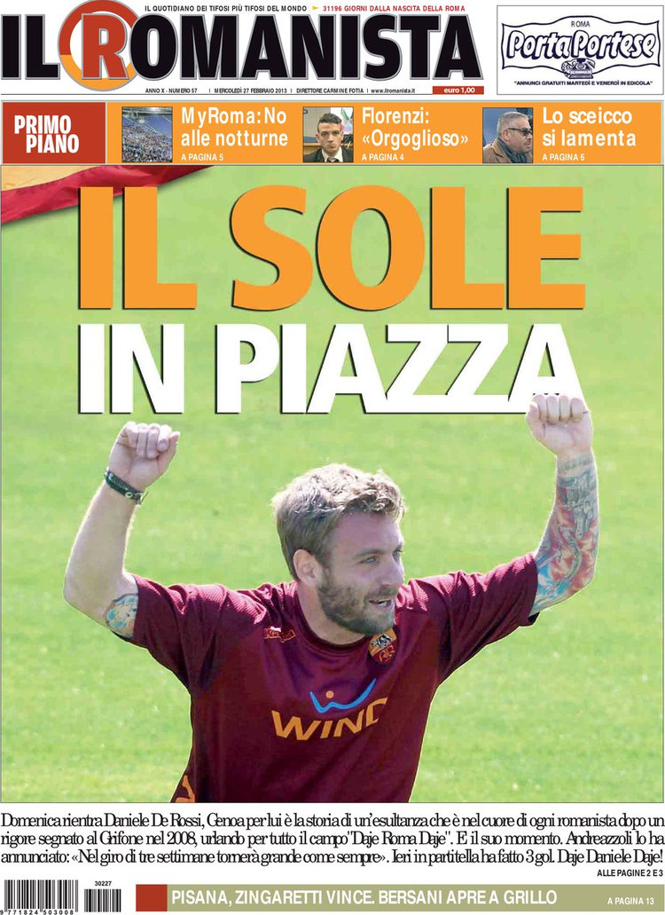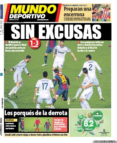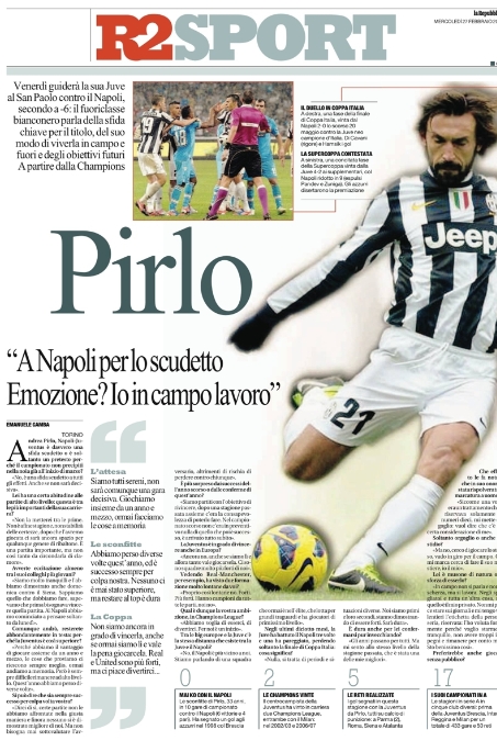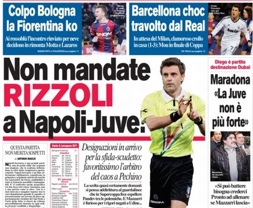 Su quasi tutti i giornali si parla di Napoli-Juve e del rischio di vedere assegnato come arbitro Rizzoli, lo stesso delle mille polemiche della finale di Pechino, quando i giocatori partenopei non si presentarono nemmeno alla premiazione per protestare con la direzione di gara. Per fortuna però non c’è solo quella partita a tenere banco. In campo internazionale è il periodo dei “clasici”, con quello spagnolo di ieri in cui il Real Madrid ha avuto la meglio sul Barcellona, e quello francese tra Olympique Marsiglia e PSG che si disputerà oggi. A Roma invece si continua a sperare che De Rossi possa ritornare in forma e che lo sceicco non sia una sòla. Vediamo le prime pagine di oggi.