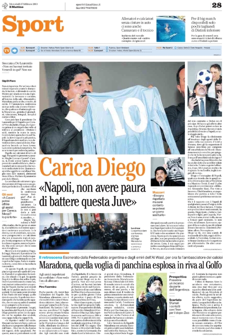 Anche se mancano ancora tre giorni, si comincia già a parlare di Napoli-Juventus. Dopo quella gara mancheranno 11 partite alla fine del campionato, ma visto il distacco che hanno i bianconeri può essere decisiva per il proseguio. Oggi inoltre se ne parla anche perché a proferir verbo sono i grandi del passato, primo fra tutti Maradona, che conferma il nostro sospetto esposto qualche giorno fa: il suo ritorno a Napoli non è solo per motivi fiscali, ma anche perché sogna di sostituire Mazzarri su quella panchina.