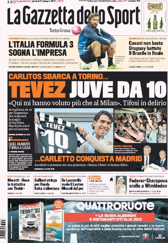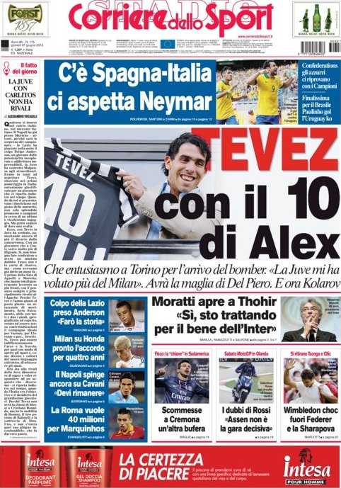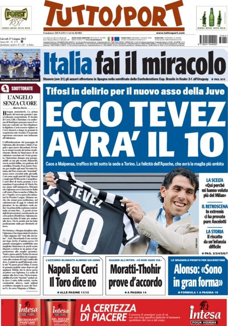 È il giorno di Carlitos Tevez. Come dimostrano le immagini delle prime pagine dei giornali sportivi di oggi che ritraggono l’attaccante stringere la maglia numero 10 che fu di Del Piero, la Juve ha messo a segno il colpo dell’anno. Le aperture dei giornali oggi si assomigliano tutte un po’, non solo nell’immagine, ma anche per il testo visto che riportano tutte la frase storica dell’Apache “La Juve mi ha voluto più del Milan”.