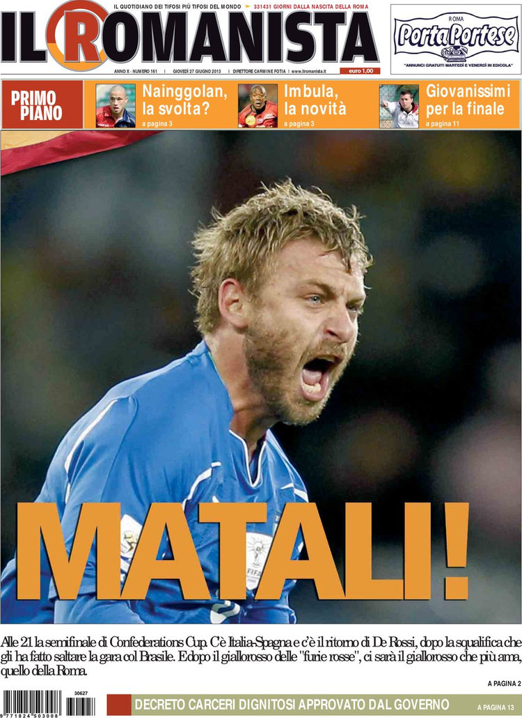 Nelle prime pagine di oggi trovano spazio anche gli azzurri, impegnati nella difficile partita contro la Spagna di questa sera. La Confederations Cup è ripartita ieri col botto, con la vittoria del Brasile sull’Uruguay, e prosegue oggi con l’Italia. Un tema che unisce tutti, anche il Romanista, che di solito parla fuori dal coro, ma che oggi si unisce agli altri incitando il suo beniamino De Rossi. Ma c’è anche tanto altro nelle prime pagine di oggi.