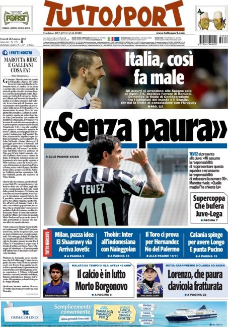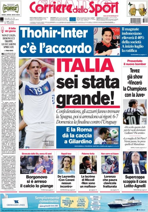 Anche se la partita contro la Spagna sarà il tema centrale di giornata, non sarà di certo l’unico. Continua a tenere banco il discorso Tevez, dopo la presentazione dell’argentino e l’assegnazione della maglia numero 10, ma anche l’indonesiano Thohir che a quanto pare avrebbe acquisito il 40% delle azioni dell’Inter e nel giro di pochi anni dovrebbe ottenere la maggioranza.