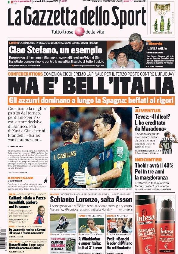 Perdere contro la Spagna ci sta. Ma perdere dopo averla dominata per tutta la partita e solo al settimo rigore fa davvero male. Fine dei giochi in Brasile dove non ci rimane altro che disputare la finale per il terzo posto, e prime pagine dei giornali dedicate proprio agli azzurri. L’amarezza si spreca e, suo malgrado, Bonucci col suo errore si prende le aperture di tutti i quotidiani di oggi.