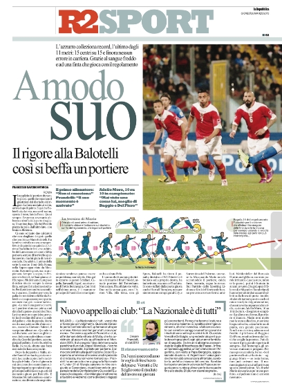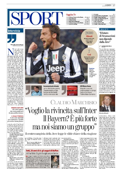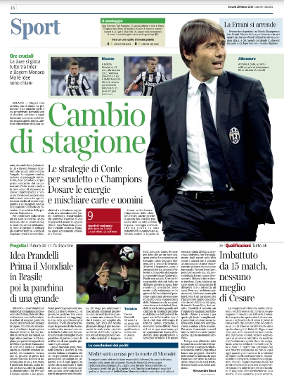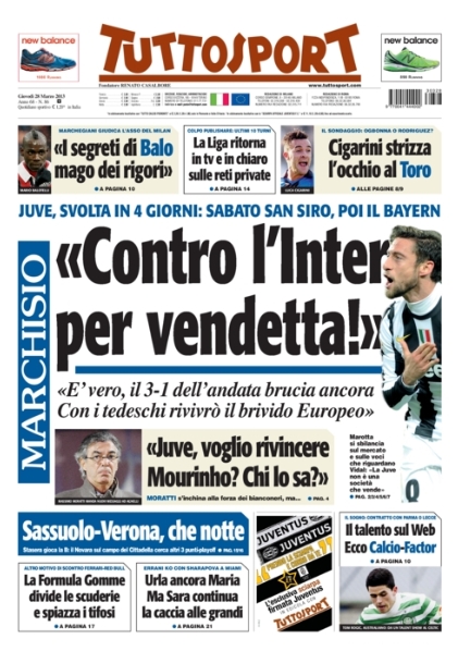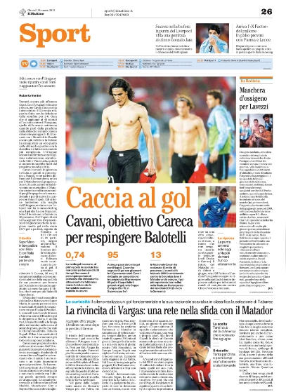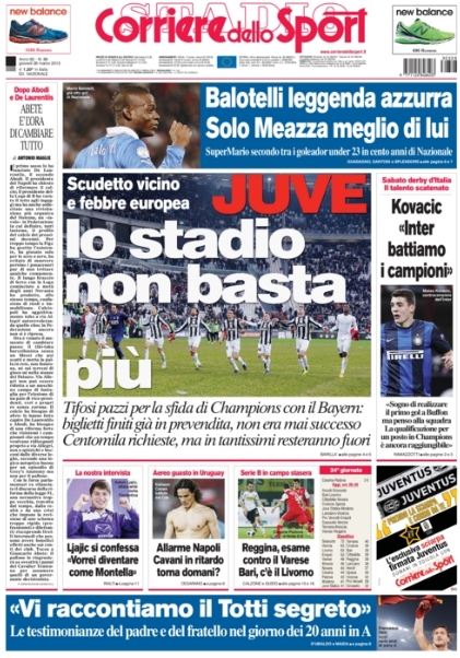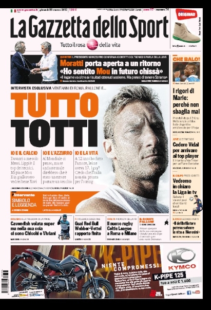 Ma non c’è solo il capitano giallorosso oggi al centro dei pensieri degli sportivi. Ancora protagonista è, nemmeno a dirlo, Mario Balotelli, la superstar del calcio italiano, il quale oggi viene analizzato soltanto dal punto di vista tecnico, ed in particolare nella sua capacità di segnare sempre i calci di rigore. Tra le altre notizie del giorno spicca l’ammissione di Moratti che vorrebbe il ritorno di Mourinho, anche se attualmente non ci sono le condizioni, e continua a salire la febbre per la sfida proprio tra i nerazzurri e la Juventus, anche se si intuisce che la testa dei bianconeri è più al Bayern che all’Inter. Ma andiamole a vedere queste prime pagine di oggi.