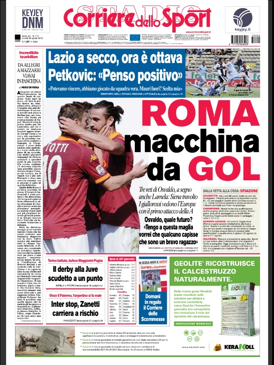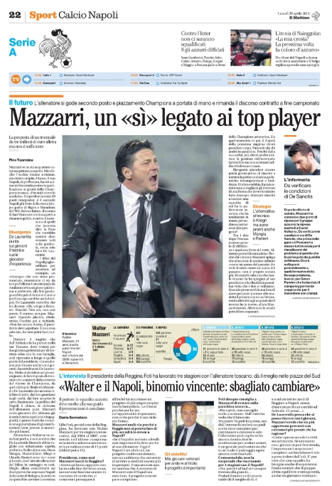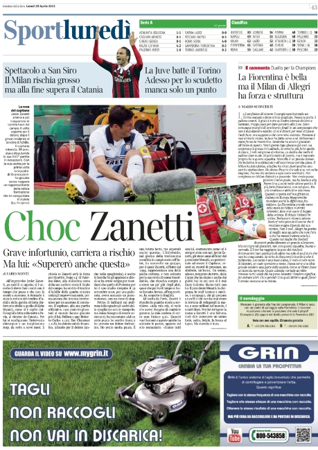 In casa Inter invece il tema pressante è il futuro di capitan Zanetti che rischia di chiudere la sua carriera dato che la rottura del tendine lo farà restare lontano dai campi per quasi un anno. E per uno che ha 40 anni è dura. In casa Napoli invece si parla solo del futuro di Mazzarri che, una volta portato a termine il suo compito (assicurato il secondo posto) ora aspetta un top player o andrà via. Questo ed altro nelle prime pagine di oggi.