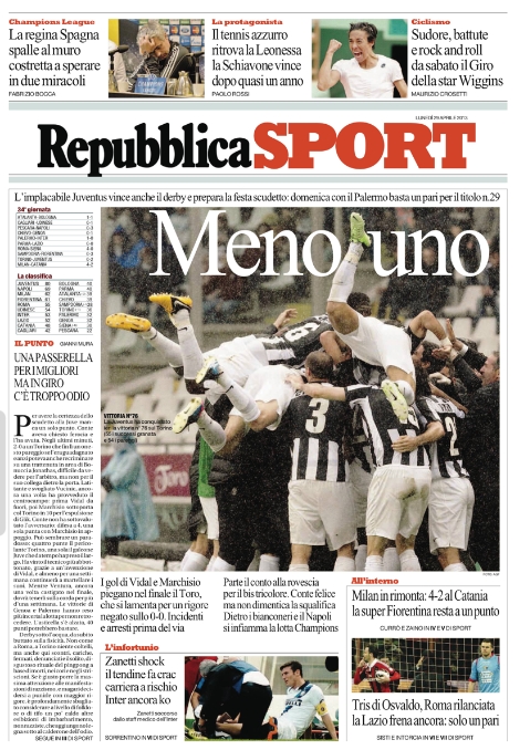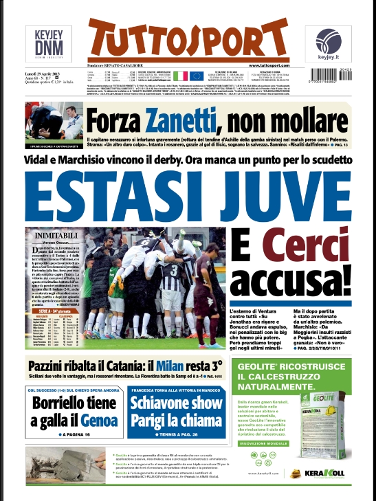 La Juventus ha lo scudetto in tasca. Aprono così quasi tutti i giornali sportivi nazionali, con il -1 dalla vittoria per i bianconeri che hanno ben 4 match ball da qui alla fine del campionato. Peccato che però la partita contro il Torino sia stata avvelenata dalle polemiche nate dal rigore non concesso ai granata e dalle accuse di razzismo a Meggiorini nei confronti di Pogba.