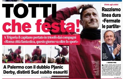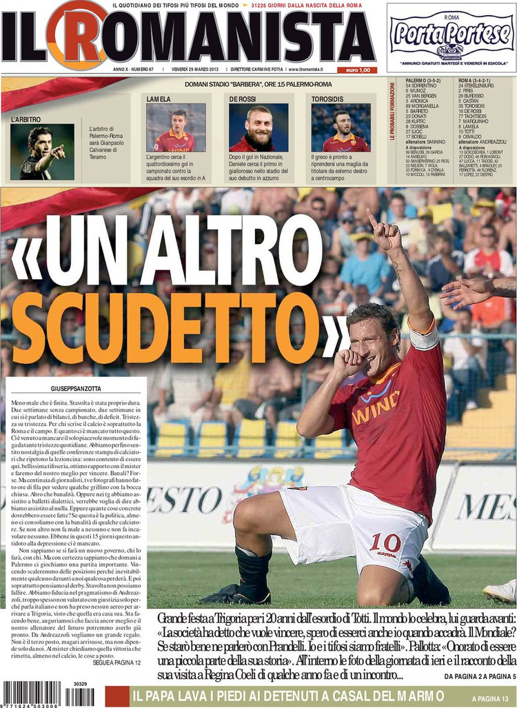 Il giorno dopo la grande festa di Trigoria non potevamo non aprire con il festeggiato. Vent’anni di carriera non capitano tutti i giorni, e così ecco che la giornata di ieri si è trasformata in un’euforia che ha contagiato tutta la città. Totti promette scudetto e forse anche una partecipazione al Mondiale, e tutti noi speriamo che riesca a farcela, anche se è chiaro che a cuore gli sta di più il buon finale di questo campionato.