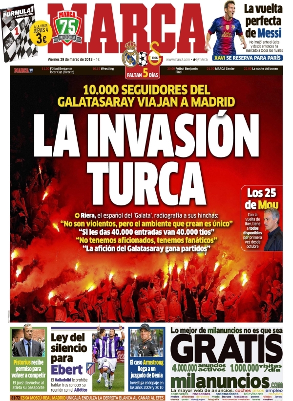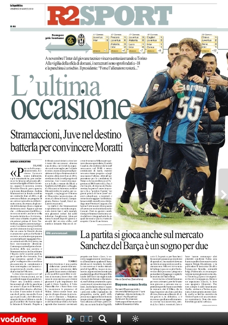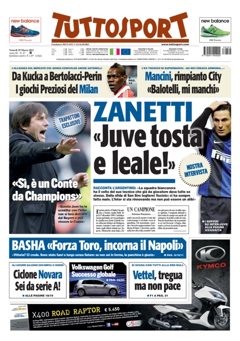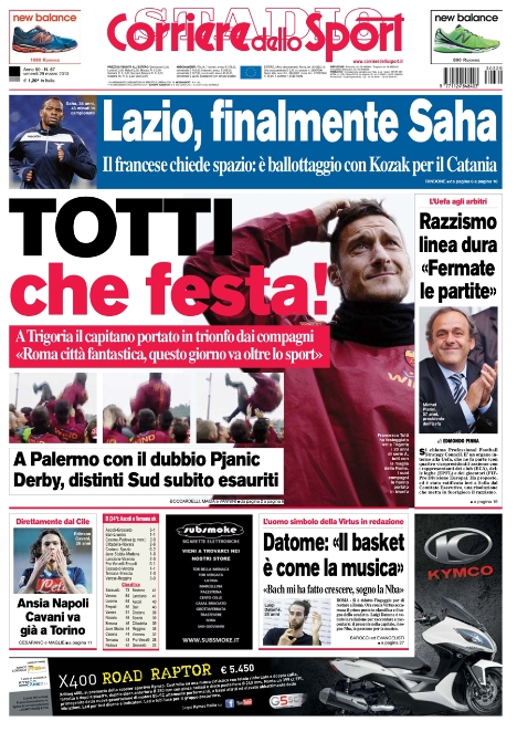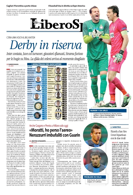 Ma se sui giornali romani le aperture sono tutte su Totti, quelli nazionali sono concentrati sulla super-sfida di domani che potrebbe decidere un pezzo di scudetto (per la Juve) ed una grossa fetta della permanenza di Stramaccioni all’Inter. Parliamo del derby d’Italia, analizzato come al solito da diversi punti di vista, e che vede una novità: mancherà Guarin. Il colombiano ha perso l’aereo e non farà in tempo a tornare per la partita. A tenere banco oggi sono anche le dichiarazioni di Cavani che dice senza mezzi termini di sognare il Real Madrid, anche se il Napoli preferirebbe cederlo al PSG. Ma andiamo a vedere le prime pagine di oggi.