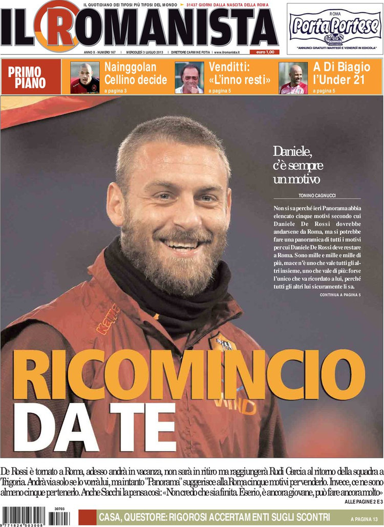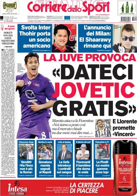 Al centro dell’attenzione di oggi ci sono anche Llorente, appena presentato e già entrato nel cuore dei tifosi bianconeri, e Thohir che rilancia per acquisire l’Inter e parla di un socio americano pronto a rilevare anche le quote di Moratti. La maggiore agitazione invece oggi è a Roma sia per la vicenda dell’inno di Venditti sia sul fronte mercato, in particolare quello in uscita. Il Romanista continua a chiedere di trattenere De Rossi (e al momento sembra essere così), ma tutto può ancora succedere visto che siamo ancora all’inizio della finestra di mercato. Qualcosina si muove anche sul fronte mercato per le altre squadre, ma vi lasciamo scoprire cosa dalle prime pagine di oggi.
