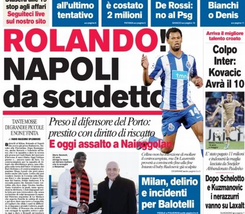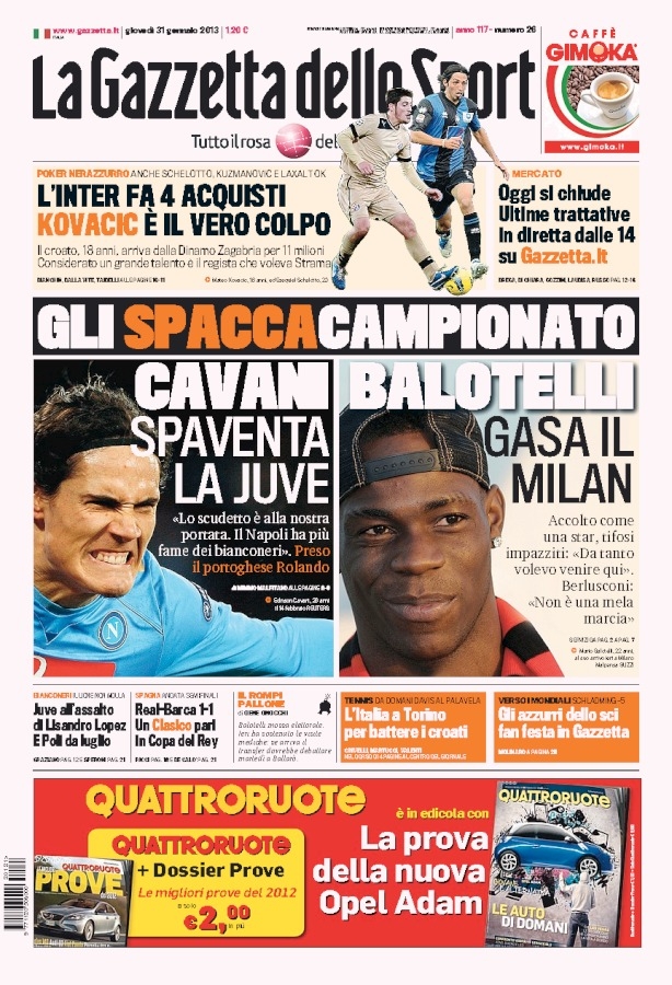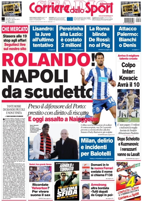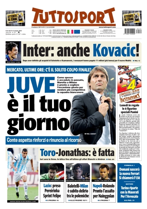 Siamo arrivati ad una delle date più attese dell’anno, l’ultimo giorno del mercato invernale. E si vede, dato che tutti i giornali sono in fermento per i possibili nuovi acquisti. A dir la verità la maggior parte delle squadre italiane i propri colpi li ha messi già a segno, basti pensare a Balotelli al Milan (che però è ancora protagonista in quasi tutte le copertine) o ai quattro nuovi acquisti dell’Inter. Ma c’è molto altro.