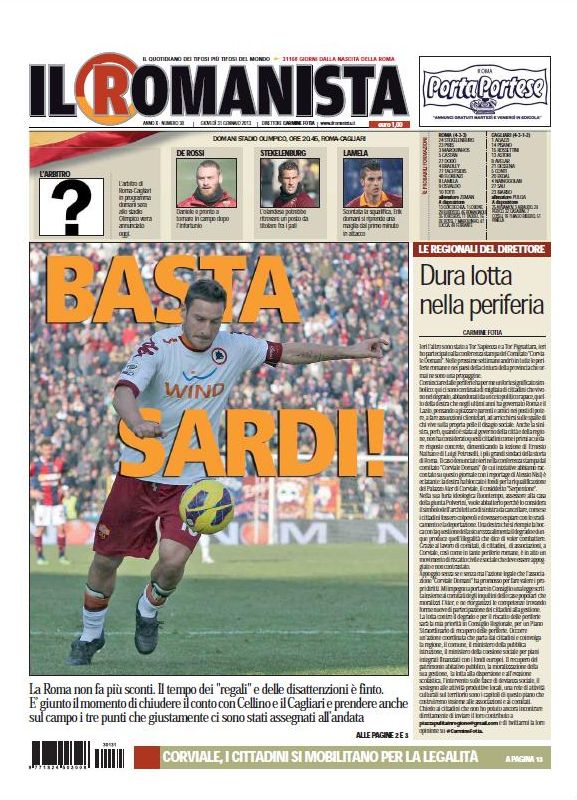 Soprattutto c’è attenzione al possibile ultimo rinforzo della Juve visto che Anelka non fa star tranquilli. Chi sarà? Ma attenzione anche al Napoli che dopo aver preso Rolando ora vuole accaparrarsi anche Nainggolan, ed al Palermo indeciso tra Bianchi e Denis. Molta attenzione c’è anche sul momento nero della Juventus, con molti giornali che cercano di analizzarlo e danno la colpa alla mancanza del bomber. La Roma invece guarda alla prossima giornata di campionato con il Cagliari con una sicurezza in più: De Rossi non partirà nemmeno questa volta. Vediamo cosa ne pensano tutti i quotidiani sportivi.