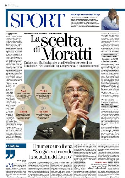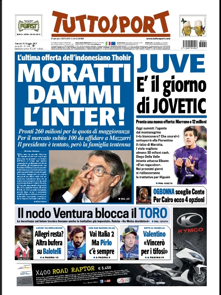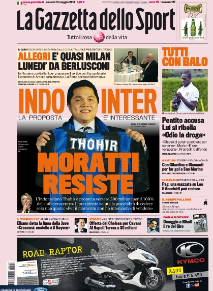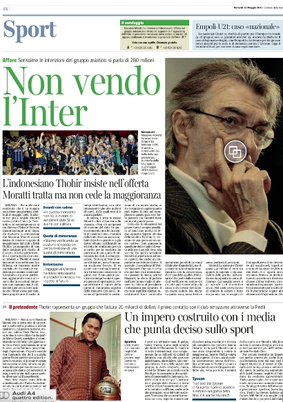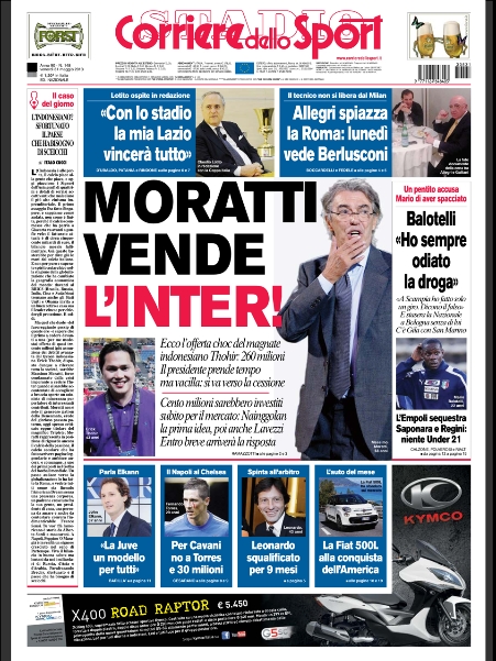 La notizia del giorno è quella che fino a qualche mese fa non ci saremmo mai immaginati: il presidente più tifoso della Serie A, Massimo Moratti, potrebbe vendere l’Inter. Già ieri avevamo dato alcune anticipazioni sulla maxi offerta dell’indonesiano Thohir, 260 milioni per l’80% della società, e questa mattina i giornali sportivi si dividono. Non solo sui numeri (c’è chi parla di 300 milioni), ma sulle intenzioni del patron. Per alcuni Moratti è pronto a lasciare, per altri no, per altri ancora invece preferisce mollare solo una quota di minoranza.