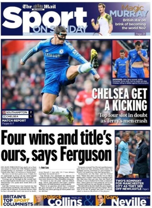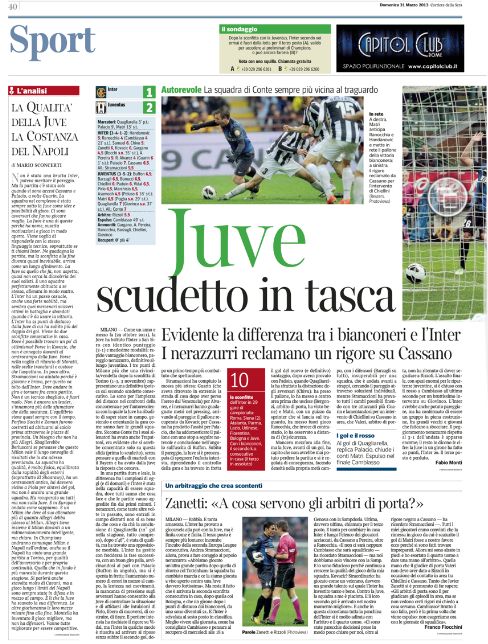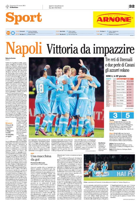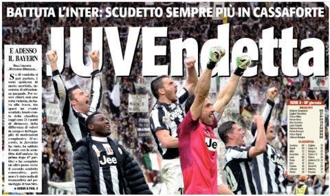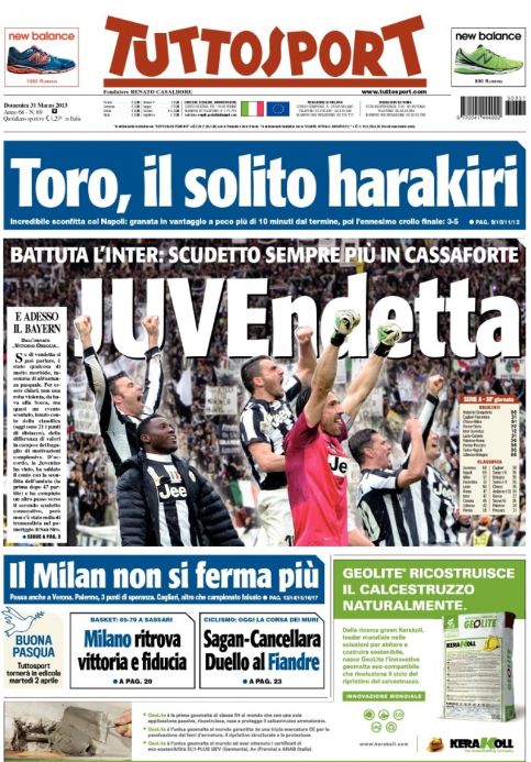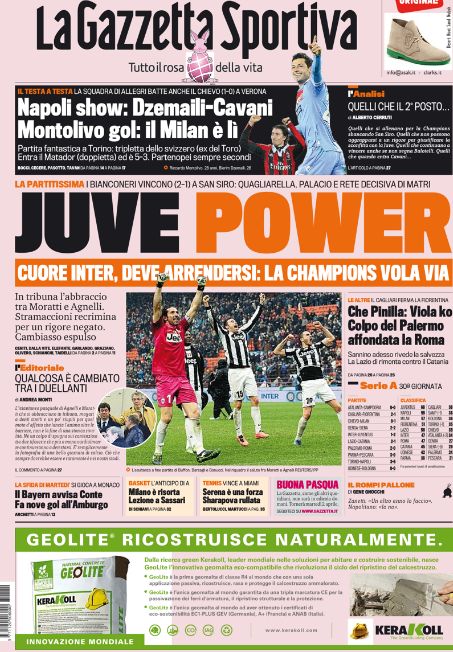 Dopo l’impresa a San Siro, le prime pagine di oggi non potevano che aprire con gli elogi alla Juventus. Battendo l’Inter, e mostrando a tutti che la superiorità degli uomini di Conte è netta, la Juve mette la mani su uno scudetto già ipotecato da tempo, ed ora non si attende altro che la matematica. Ci sono però diversi spunti dopo un sabato insolito con 10 partite. Uno di questi è il Napoli che è stato in grado di compiere l’impresa di ribaltare un risultato che sembrava negativo negli ultimi dieci minuti, ma soprattutto in grado di mettere a segno ben 5 gol. Una buona notizia per Mazzarri che finalmente rivede quel carattere che era andato perdendosi.