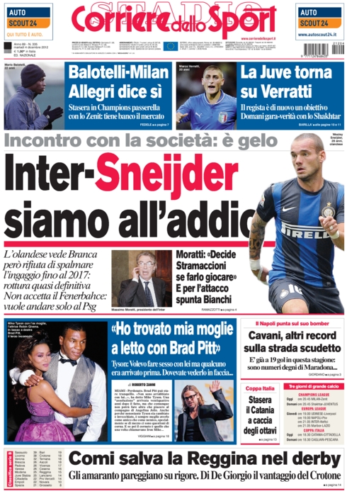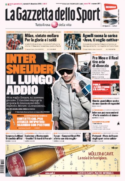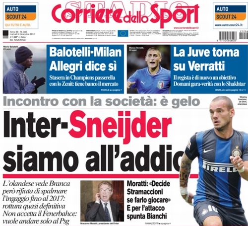 L’avventura di Wesley Sneijder è ormai ai titoli di coda. Lo dicevamo noi da giorni e la conferma arriva oggi dai principali quotidiani sportivi italiani. Sia per la Gazzetta dello Sport che per il Corriere dello Sport la notizia del giorno è questa: l’olandese ha rifiutato il rinnovo del contratto e dunque molto probabilmente a gennnaio partirà.