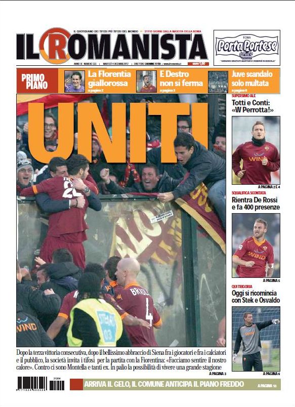 Un occhio puntato sull’estero ha come obiettivo come sempre Mourinho, sempre più lontano da Madrid e probabilmente vicino al PSG, mentre tornando dalle nostre parti il Romanista titola semplicemente “Uniti”, richiamando alla coesione una squadra fatta di tanti talenti che a volte hanno giocato ognuno per se stesso, ma che tutti insieme possono raggiungere grandi risultati. A voi le prime pagine dei quotidiani di oggi.