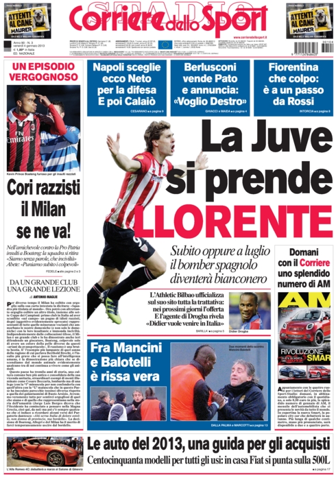Ma basta guardare al passato e diamo uno sguardo all’immediato futuro. La notizia del giorno è che la Juventus si prepara ad ingaggiare Llorente. Secondo quanto rivelano il Corriere dello Sport e Tuttosport, i bianconeri avrebbero avviato per canali ufficiali la trattativa con l’Atletico Bilbao, ed il club spagnolo ha spiattellato tutto sul suo sito internet. Per il quotidiano torinese ormai i bianconeri avrebbero già in tasca l’attaccante, tanto o a gennaio o a luglio arriverà, resta solo appunto da vedere quando.