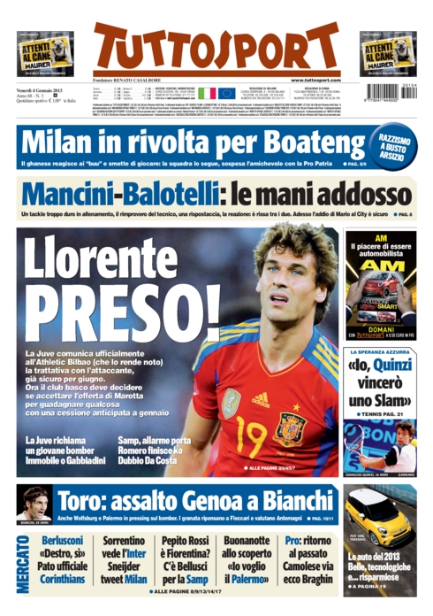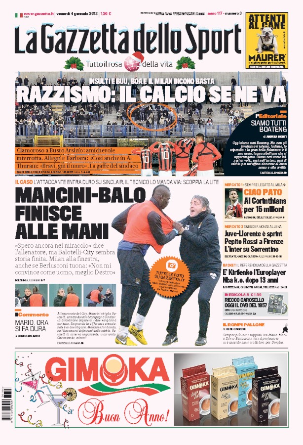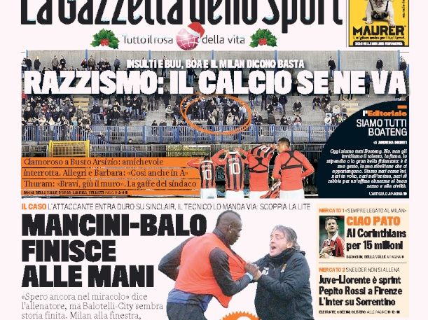 La giornata di ieri è stata piena di spunti, ma l’apertura di quasi tutti i quotidiani sportivi di oggi è dedicata ai due avvenimenti del pomeriggio che hanno fatto vergognare chi il calcio lo ama veramente. Uno è stato la sospensione di Pro Patria-Milan in seguito ai fischi razzisti contro Boateng e gli altri giocatori di colore del Milan, l’altro è la vergognosa rissa tra Balotelli e Mancini che senza dubbio avrà conseguenze su entrambi.