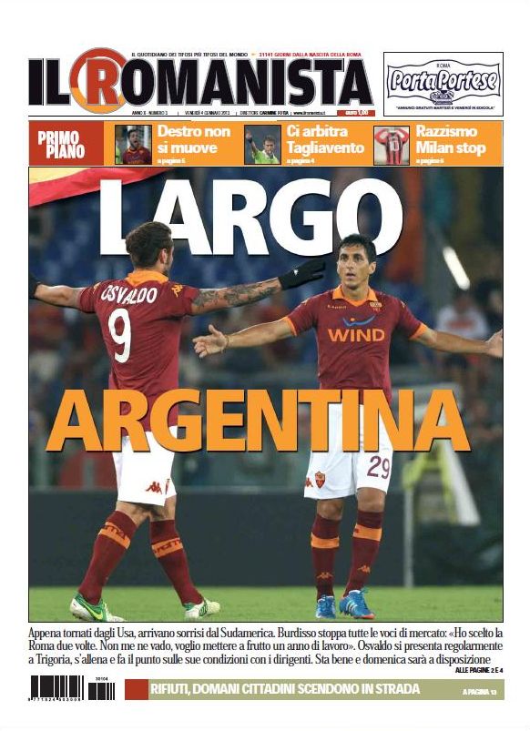 Per il resto si parla di colpi di mercato “minori” per modo di dire, mentre arrivano buone notizie sul fronte Roma: Osvaldo è tornato, ha chiarito la sua posizione ed è ufficialmente fuori dal mercato. L’ultimo assalto alla diligenza giallorossa sembra essere quello a Destro del Milan, ma nemmeno Berlusconi sembra così tanto convinto di volerlo effettuare.