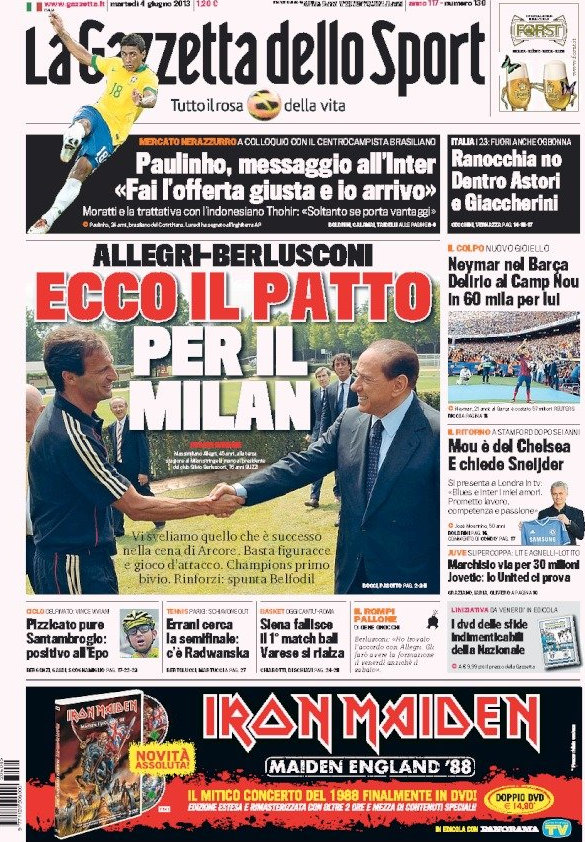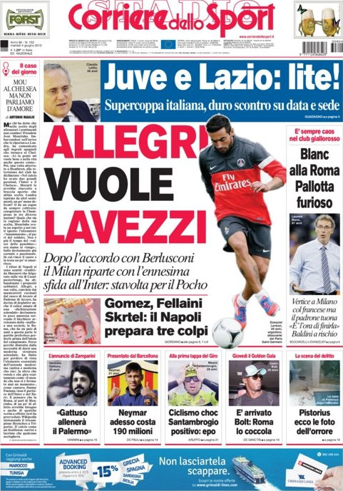 Il giorno dopo la riconferma di Allegri tutte le prime pagine non potevano che essere incentrate sulle prossime mosse di mercato dei rossoneri. Il Conte Max infatti avrebbe chiesto certezze sul mercato per poter rimanere, e sembra che Berlusconi sia disposto a fornirgliele. Secondo il Corriere dello Sport la mossa più azzardata sarebbe l’ingaggio di Lavezzi che sono due anni che flirta con l’Inter, ma che potrebbe essere soffiato dai rossoneri in un perfetto stile dispetto da derby.