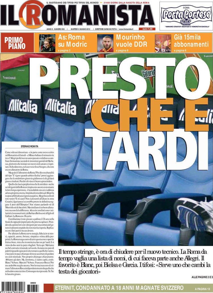 A proposito di internazionale, e l’Inter? I nerazzurri sono ancora alle prese con la vicenda Thohir, e quindi almeno finché questa matassa non sarà dipanata, difficilmente riusciranno ad agire sul mercato. L’unico nome che si fa è Basta dell’Udinese, troppo poco per la stagione della rinascita. Anche in casa Juve continua a rimanere tutto fermo perché le trattative per Jovetic e Tevez vanno al rilento, mentre per la Roma oggi potrebbe essere il giorno della svolta: Laurent Blanc potrebbe essere il nuovo allenatore.