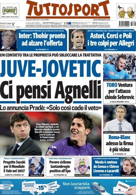 Per il resto i nomi che si fanno sono quelli che avevamo già anticipato ieri: Astori, Cerci e così via, più una nuova aggiunta: Belfodil. A scuotere il mercato oggi è anche il Napoli che secondo diversi giornali sarebbe vicino all’acquisto di tre top player: Mario Gomez, Skrtel e Fellaini, in modo da far assumere al club una connotazione decisamente internazionale.