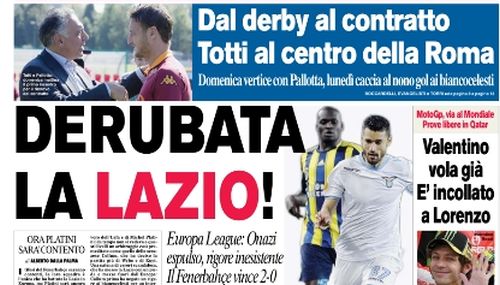 Furto in casa Lazio. Almeno secondo l’opinione del Corriere dello Sport che apre gridando allo scandalo avvenuto ieri sera quando l’espulsione di Onazi ha praticamente regalato mezza qualificazione al Fenerbahce. Secondo Petkovic, ed il giornale romano, il rigore che ha sbloccato la partita non c’era, ma fatto sta che la prossima settimana l’Italia rischia davvero di ritrovarsi senza più squadre a rappresentarla nelle coppe europee.
