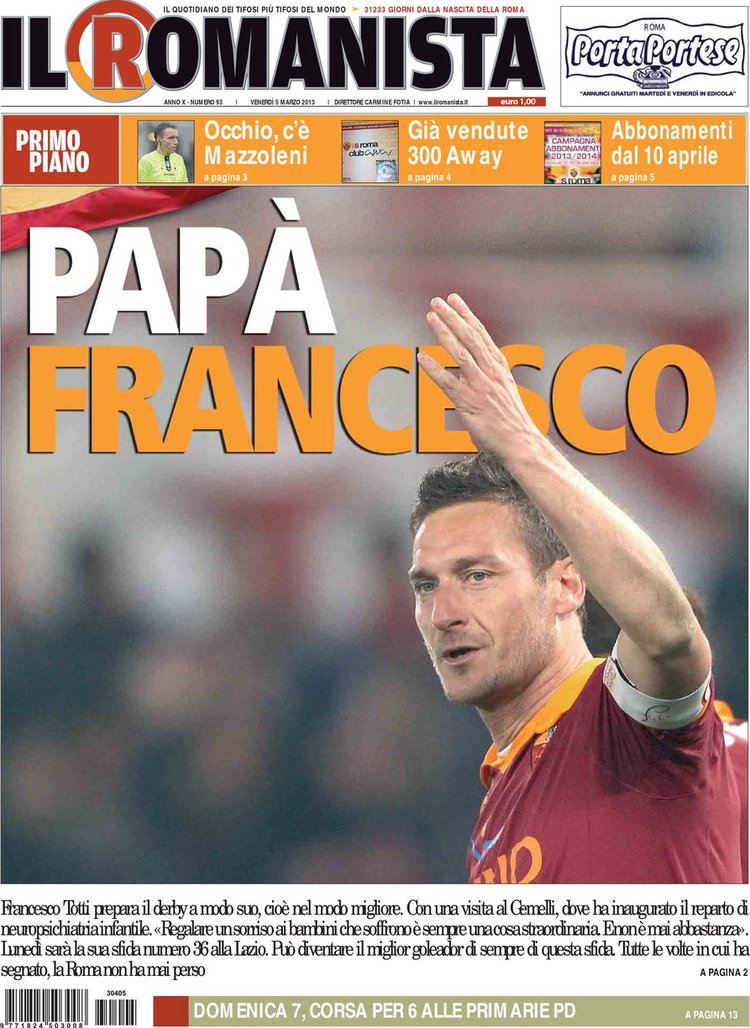 Di calcio giocato però si parla poco. Tiene banco il Milan, che quando non ci sono partite tira sempre con le vicende di El Shaarawy e Balotelli; ma comincia anche a farsi sentire l’aria del derby, ed in particolare si ritorna a parlare di Francesco Totti, protagonista indiscusso di tante stracittadine, che ieri per sciogliere un po’ la tensione ha inaugurato un reparto pediatrico al policlinico Gemelli per dimostrare come gli uomini di sport non sono solo calci al pallone.
