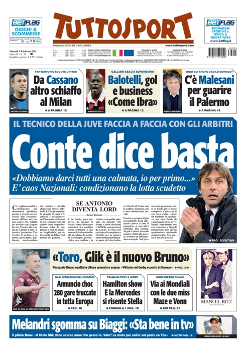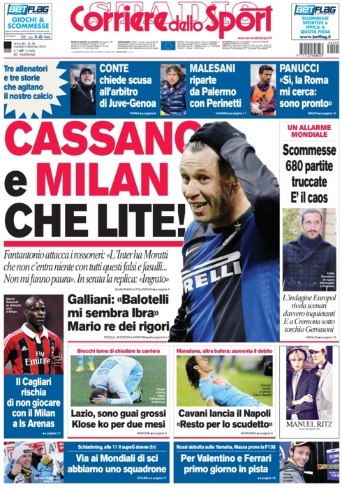 Molto più interessante è invece la polemica tra Cassano e la sua ex squadra sul Corriere, con i rossoneri che lo considerano un ingrato perché “spara a zero” contro la società, difendendo invece Moratti e Stramaccioni. Non mancano le polemiche sugli arbitraggi, come sottolinea Tuttosport però siamo forse alla fine della guerra, con Conte che chiede scusa e chiede a tutti di calmarsi.