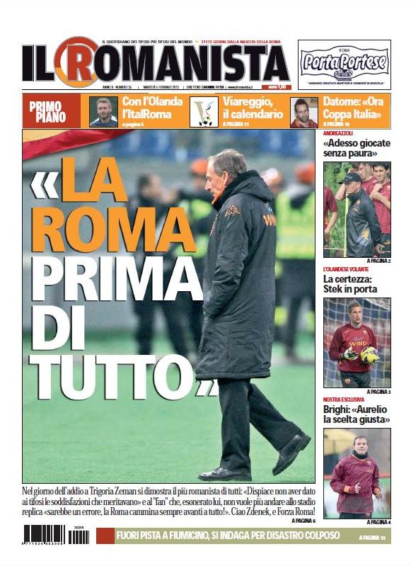 I giornali nazionali invece parlano degli azzurri, mentre per rimanere in Serie A la notizia che potrebbe arrivare oggi dovrebbe essere che il nuovo allenatore della Roma è Christian Panucci. Ancora non c’è l’ufficialità, ma la sua ammissione lascia poco spazio all’interpretazione. Chiudiamo con le parole di Zeman che, per la prima volta dall’esonero, si scusa con il popolo giallorosso ed invita i tifosi ad andare ancora allo stadio perché la Roma “cammina sempre avanti a tutto”. Almeno lascia a testa alta. A voi le prime pagine di oggi.