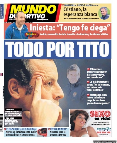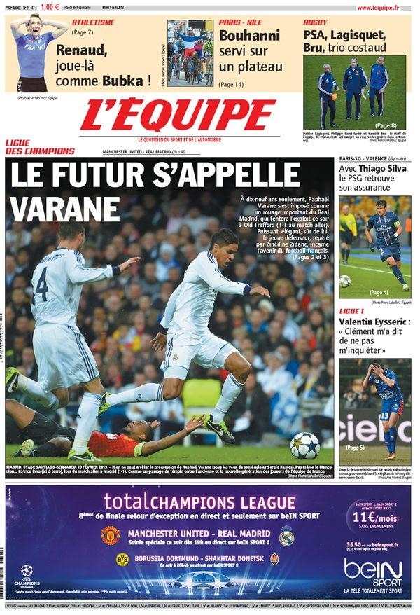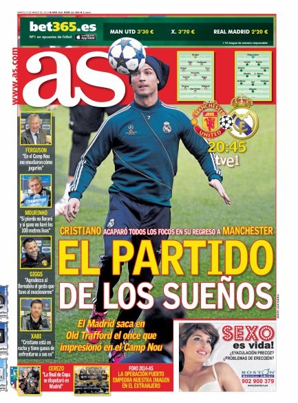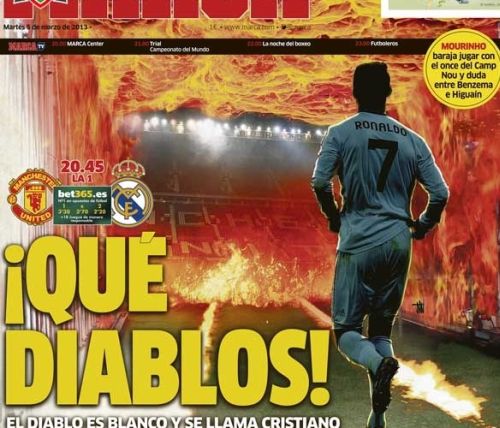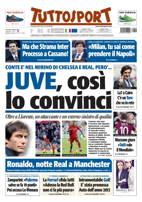 Anzi, sarebbero due le persone che non vogliono bene all’Inter, le stesse che hanno spinto per far andare lui via. Insomma, Moratti ha un bel da fare per liberare l’ambiente nerazzurro da figure oscure. Ma parliamo di calcio giocato. Oggi a tenere banco sono essenzialmente due aspetti: la fuga della Juventus che ormai non lascia altro spazio che alla lotta per il secondo posto, ed il ritorno delle coppe europee. In particolare è una la sfida che tiene tutti con il fiato sospeso, Real Madrid-Manchester United che per molti sarebbe dovuta essere la finale di quest’anno di Champions, ma che inevitabilmente costringerà una delle due squadre ad abbandonare la competizione già da stasera. Vediamo le prime pagine di oggi.