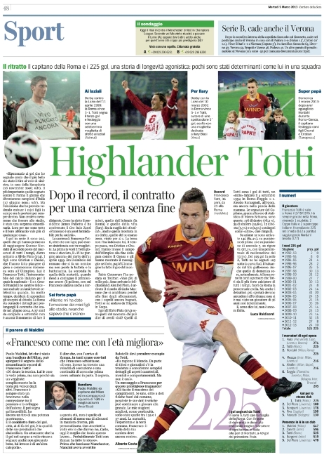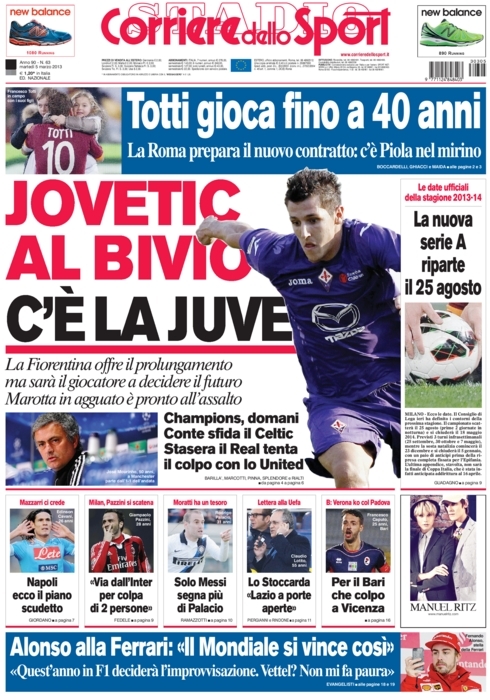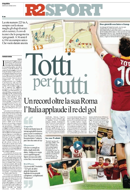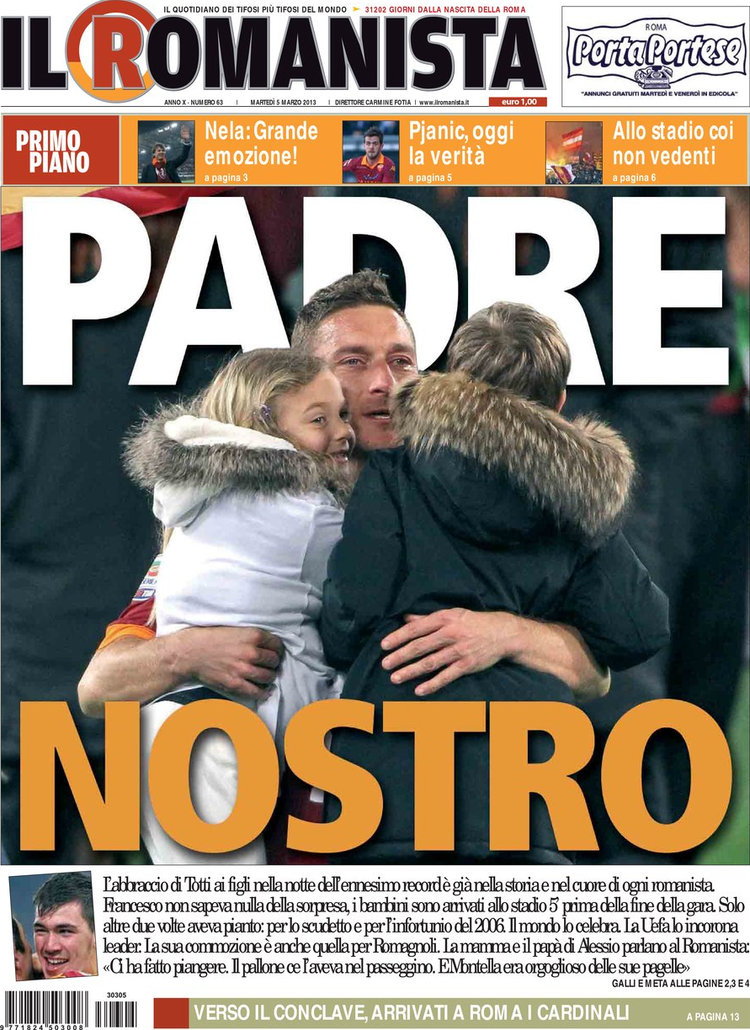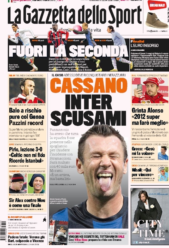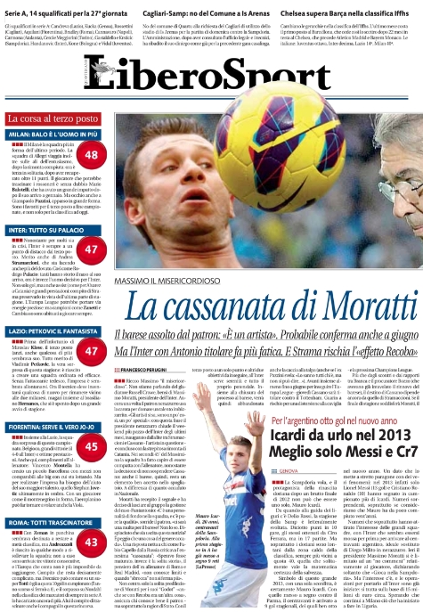 Non si ferma l’ondata di orgoglio di romanisti e non romanisti in merito alla grande serata da record di Totti, sia dal punto di vista sportivo che da quello umano, e questa si riflette su molte prime pagine di oggi. La notizia del giorno però oggi è un’altra, e cioè che nello spogliatoio dell’Inter ci sarebbe una talpa. Già Stramaccioni aveva spiegato che chi aveva rivelato del suo litigio con Cassano “non voleva bene all’Inter”, ed ora la conferma arriva da Pazzini, ex nerazzurro di lusso, che afferma di sapere di chi si tratta.