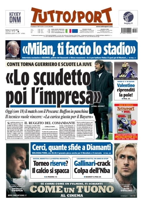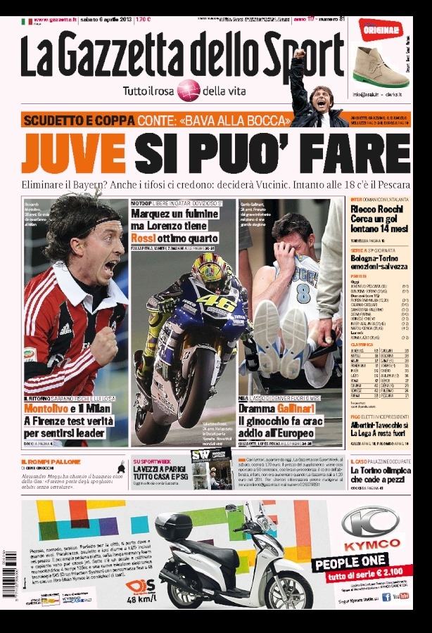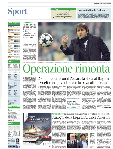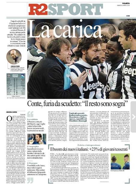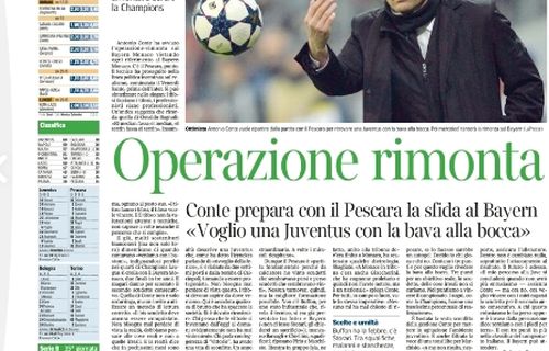 Oggi ritorna il campionato, ma ad una squadra, la Juventus, sembra non interessare. Sarà che contro ci sarà forse la più facile delle avversarie, quel Pescara ultimo in classifica e già con la testa al prossimo campionato cadetto, ma è evidente come ogni pensiero va al ritorno di Champions League contro il Bayern Monaco. Quasi tutti i giornali, anziché parlare della partita di campionato, cercano in qualche modo di caricare i bianconeri, un po’ come fatto da quelli spagnoli nello scorso turno per Real e Barça, incitandoli alla remuntada. Ci riusciranno?