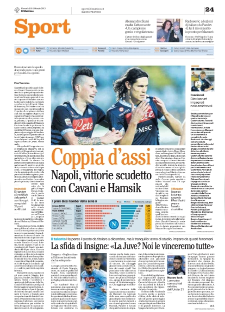 Ma mentre i quotidiani nazionali parlano di Italia, quelli prettamente sportivi si concentrano su altri discorsi. Il Corriere ad esempio presenta Laxalt, il neo acquisto dell’Inter che però non sarà disponibile prima della prossima stagione. La Gazzetta parla di allenatori in bilico come Stramaccioni che se non riprende a vincere potrebbe essere messo alla porta, e Allegri su cui aleggia l’ombra di Van Basten; per Tuttosport invece bisogna guardare al top player per la prossima stagione che dev’essere necessariamente Jovetic, acquistabile per la modica cifra di 35 milioni di euro, praticamente quasi l’intero premio Champions. Non mancano altri spunti interessanti, ma li lasciamo alla lettura delle prime pagine di oggi.
