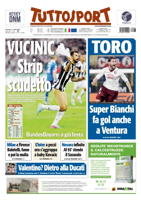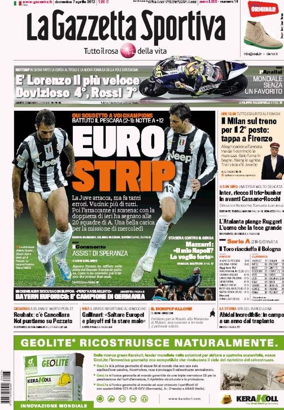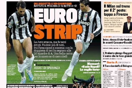 Le prime pagine di oggi non potevano che aprirsi con lo strip di Vucinic che vale un bel pezzo di scudetto dopo la vittoria sofferta contro il Pescara. L’attaccante montenegrino, o per meglio dire le sue mutande bianche, vengono così sbattuti in prima pagina un po’ ovunque, un modo decisamente originale di esultare…e di aprire una rassegna stampa.