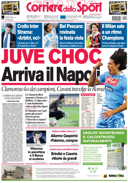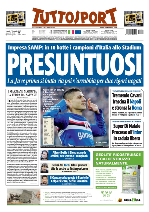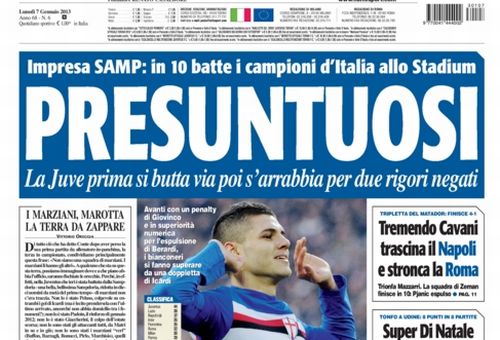 Oggi apriamo la consueta rassegna stampa con un titolo che ci trova pienamente d’accordo: “Presuntuosi!”. I diretti interessati a questa accusa sono i giocatori della Juventus, e a definirli tali non sono degli avversari, ma proprio il giornale di casa, Tuttosport. Una partita in cui si è in vantaggio di un gol e di un uomo non si può perdere, e la sconfitta arriva solo se si è, appunto, presuntuosi. Il lato positivo è che questo risultato fa bene a tutti. Fa bene al calcio perché il campionato si riapre, fa bene alle inseguitrici perché sperano ancora nello scudetto, ma fa bene anche alla Juve che ha imparato che una prestazione del genere non la può più ripetere.